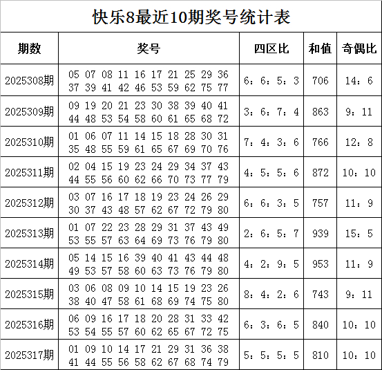 福彩快乐8第2025317期开出奖号:01 09 10 14 17 21 29 31 36 38 41 44 55 56 58 62 67 68 74 79,其中奖奇偶比10:10,四区比为5:5:5:5。
