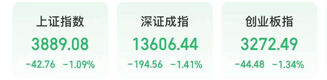 今天,A股调整。截至收盘,上证指数下跌1.09%,深证成指下跌1.41%,创业板指下跌1.34%。