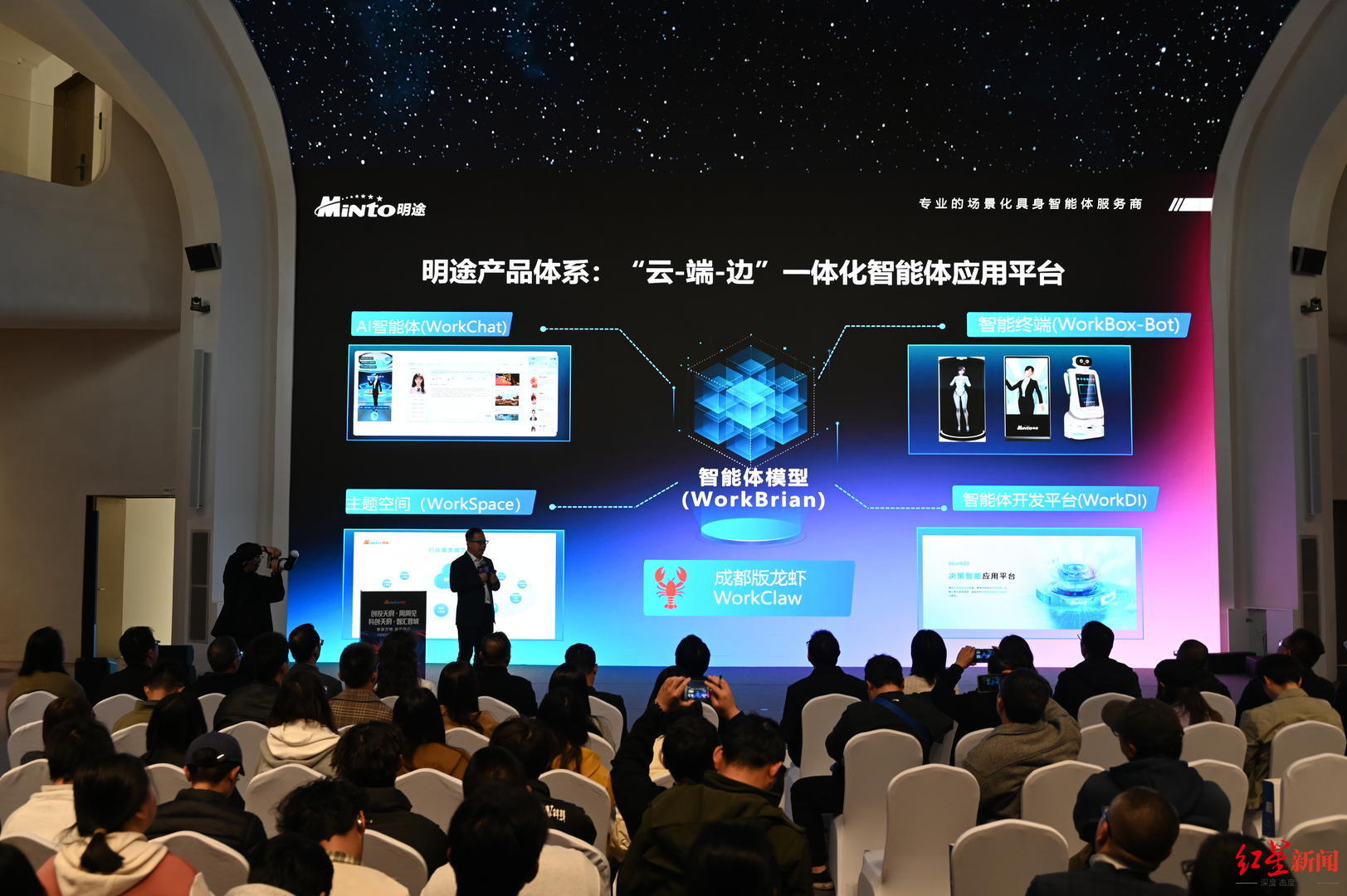 看产业端,成都正快速构建起一个完整的智能体生态。3月20日,就在腾讯公开课启幕前一天,明途科技在成都科创生态岛举办发布会,推出自主研制的“成都版龙虾”WorkClaw,其搭载的WorkBot智盒一体机,实现了“开箱即用、零代码部署”,让不懂代码的“小白”也能在2分钟内组建自己的“AI员工团队”,同时将算力消耗降低45%,还解决了数据安全难题。与此同时,明途科技还推出群体智能应用平台、AgentSkill开发工具,构建行业智能体社区,设立20万元专项基金,仅一个月就孵化200余位OPC超级个体,助力技术变现。